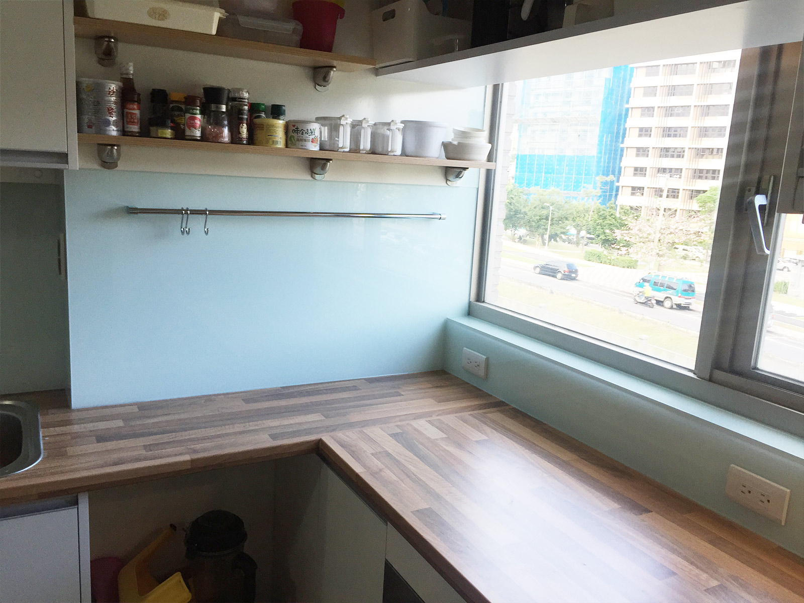白色烤漆玻璃搭配客戶木質的檯面十分清新好看